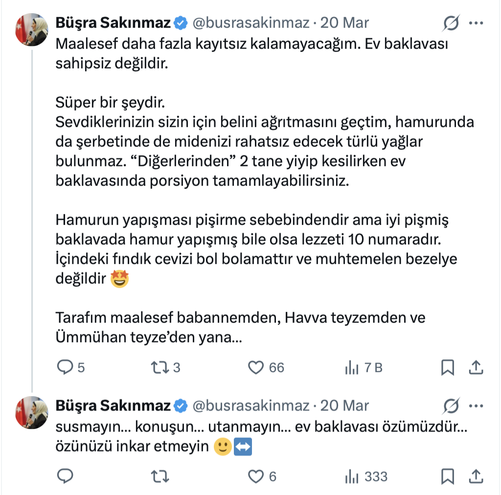 Hatice Sühan / TANIK - Siyasetin yoğun ve ciddi gündemine sosyal medyadan tebessüm ettiren bir mola geldi. DEVA Partisi Tanıtım ve Medya'dan Sorumlu Genel Başkan Yardımcısı Büşra Sakınmaz, X (Twitter) hesabı üzerinden yaptığı "Ev Baklavası" çıkışıyla sosyal medya kullanıcılarının yüzünü güldürdü.