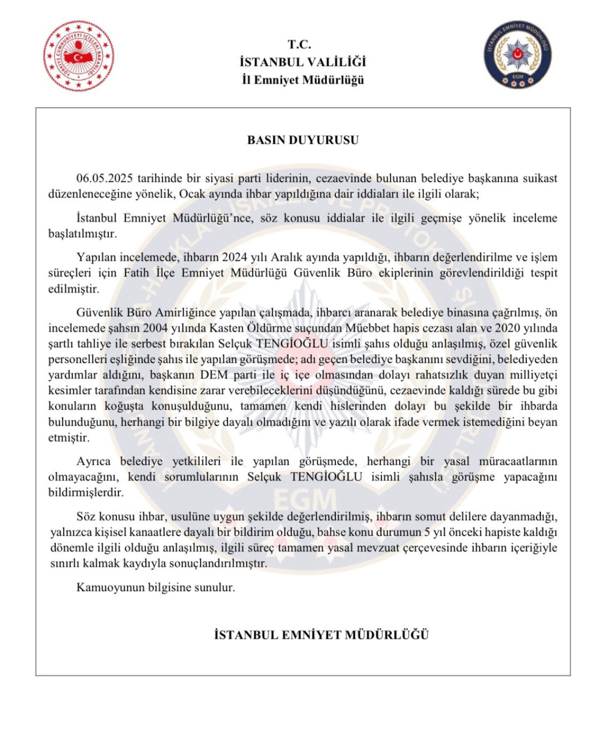 06.05.2025 tarihinde bir siyasi parti liderinin, cezaevinde bulunan belediye başkanına suikast düzenleneceğine yönelik, Ocak ayında ihbar yapıldığına dair iddiaları ile ilgili olarak; İstanbul Emniyet Müdürlüğü'nce, söz konusu iddialar ile ilgili geçmişe yönelik inceleme başlatılmıştır.